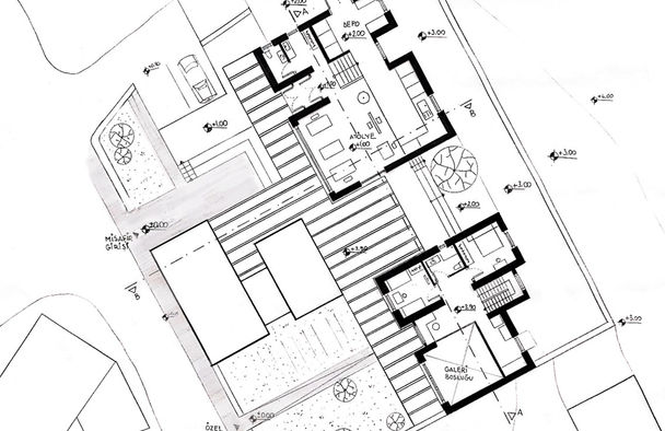 Arazide 3 kütle bulunmaktadır; konut, atölye ve sergi-satış alanı. Bu 3 kütlenin arazideki yerleşimi ile 3 farklı avlu oluşmaktadır: Konuta özel avlu, konut ve atölye arası yarı kamusal avlu ve sergiye, dokuma ürünlerini satın almaya gelen misafirler için kamusal avlu. Avlularda amfi sistemi ve pergolalar ile desteklenen yarı açık alanlar bulunmaktadır. Planlar, iki ağır ve opak kütle arasında daha hafif ve saydam kütleden oluşmaktadır. Böylece benzer tasarım dili oluşturulmuştur. Planlarda işlev taşıyan mekânların bağlılığı ve diğer kütleler ile geçiş niteliği taşıyan mekânların bağlılığı bir arada düşünülmüştür. Taş duvardan oluşan yapılar, köyün dokusuna uyum sağlamaktadır. Taş duvarlı kütlelerin arasında ise daha büyük açıklıklar yer almaktadır.